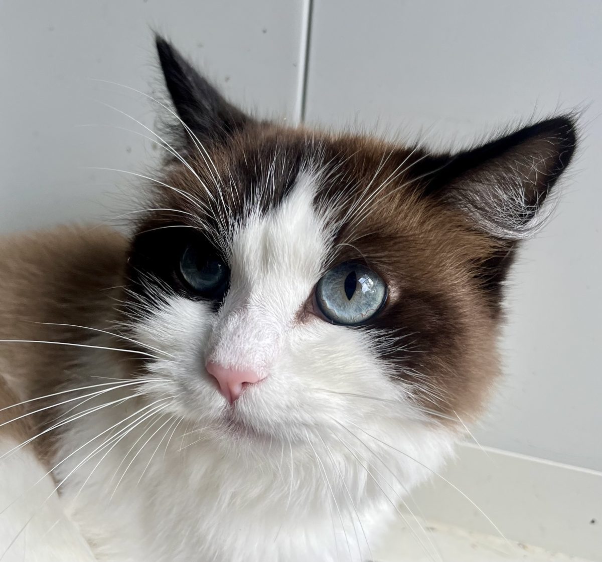 Maggie is a sweet, gentle girl who enjoys a peaceful home and the comfort of familiar faces. She’s not demanding or loud — instead, she shows her affection in soft ways, with gentle head bumps, relaxed cuddles, and those classic Ragdoll purrs.