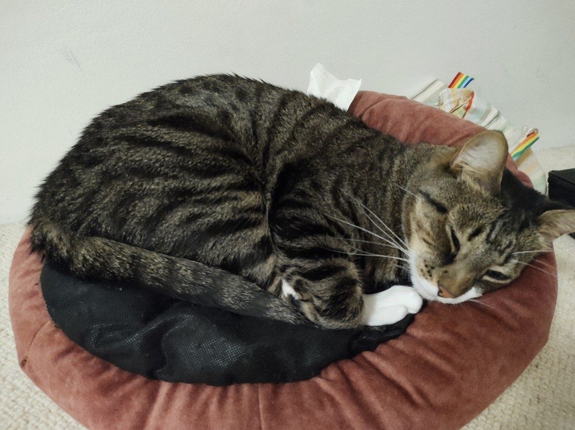 Kuzya is a 6.5-year-old Domestic Shorthair Tabby with a sweet personality and a strong sense of confidence. He forms close bonds with his chosen people and can be incredibly affectionate and gentle once trust is established. While he’s not a clingy cat, he enjoys company in his own time and loves being petted.